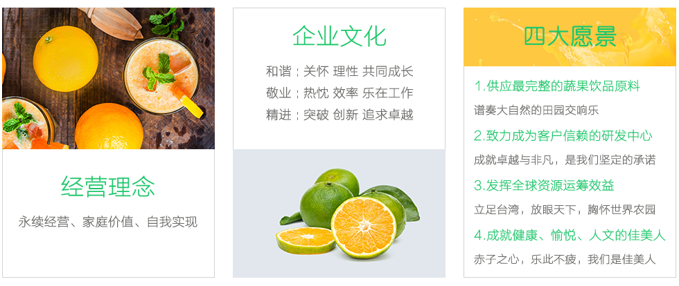 我們秉承著專業(yè)技術(shù)及嚴(yán)謹(jǐn)?shù)慕?jīng)營(yíng)態(tài)度,在不斷地鉆研、開(kāi)發(fā)與創(chuàng)新下,成功地將四季水果的新鮮風(fēng)味與營(yíng)養(yǎng)長(zhǎng)期完整的保存。十月份果實(shí)成熟后,我們將最新鮮的果實(shí)用最天然的方式加工成果汁。